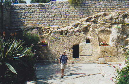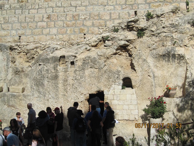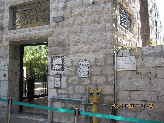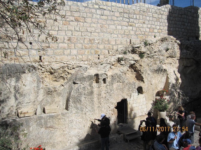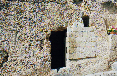 The Garden Tomb - This is one possible location of Christ's burial. The Gospel of John records that the body of Jesus was placed in a newly carved tomb originally made for the wealthy Joseph of Arimathaea. General Gordon discovered a tomb (known as the garden tomb) within a short distance below a rocky cliff. Gordon believed at the top of the cliff on the hill was where Christ was crucified. He postulated that the hill was "Golgotha" and Christ's body was taken to the tomb below the rocky cliff as shown in the photos.