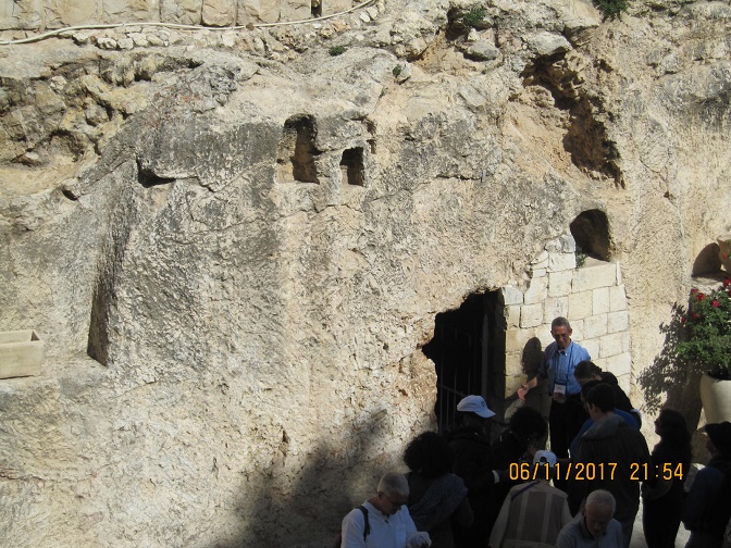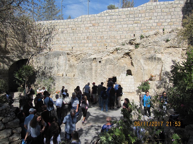 The Garden Tomb - This is one possible location of Christ's burial. The Gospel of John records that the body of Jesus was placed in a newly carved tomb originally made for the wealthy Joseph of Arimathaea. General Gordon discovered a tomb (known as the garden tomb) within a short distance below a rocky cliff. Gordon believed at the top of the cliff on the hill was where Christ was crucified. He postulated that the hill was "Golgotha" and Christ's body was taken to the tomb below the rocky cliff as shown in the photos.
